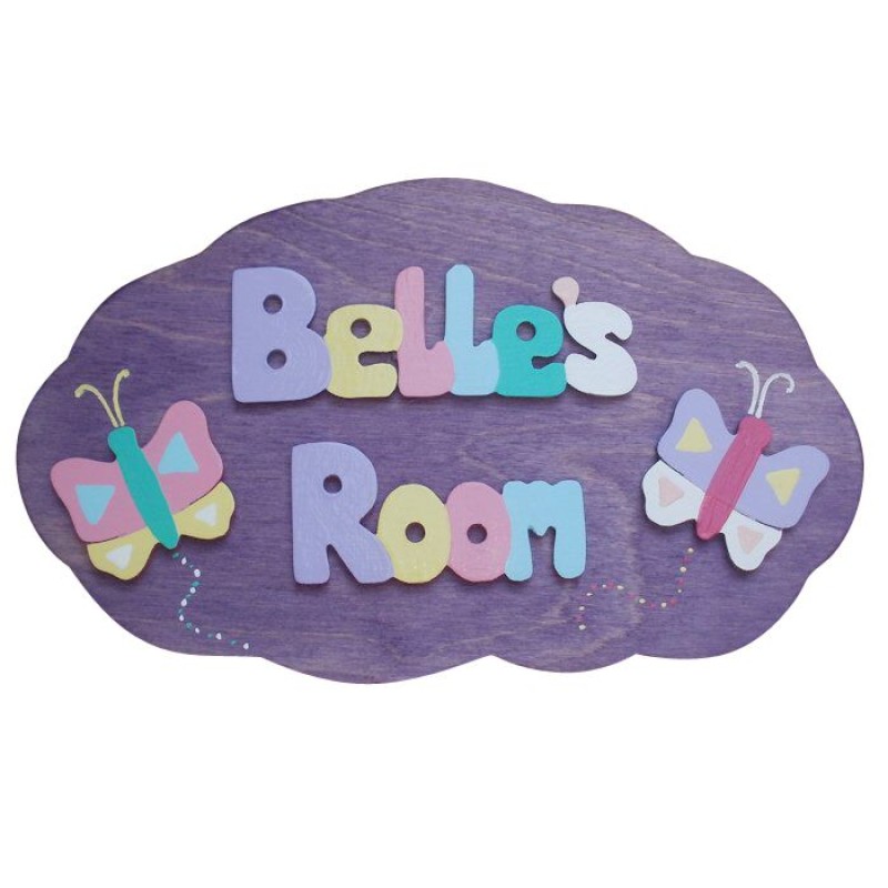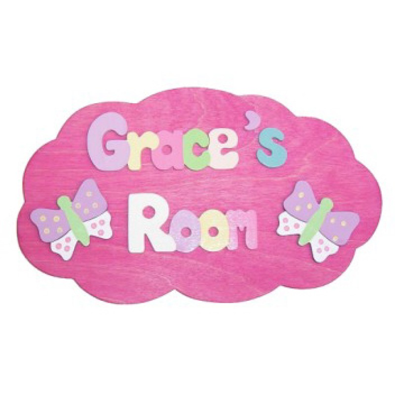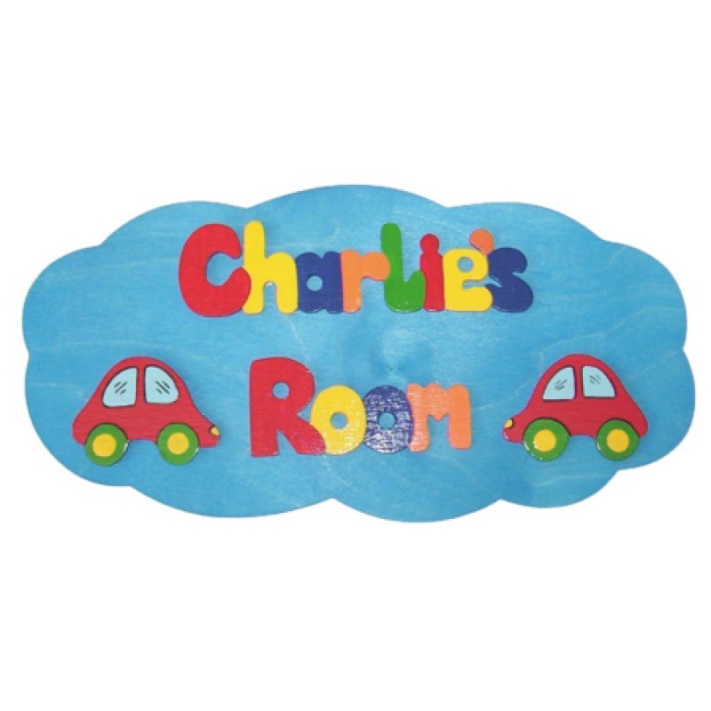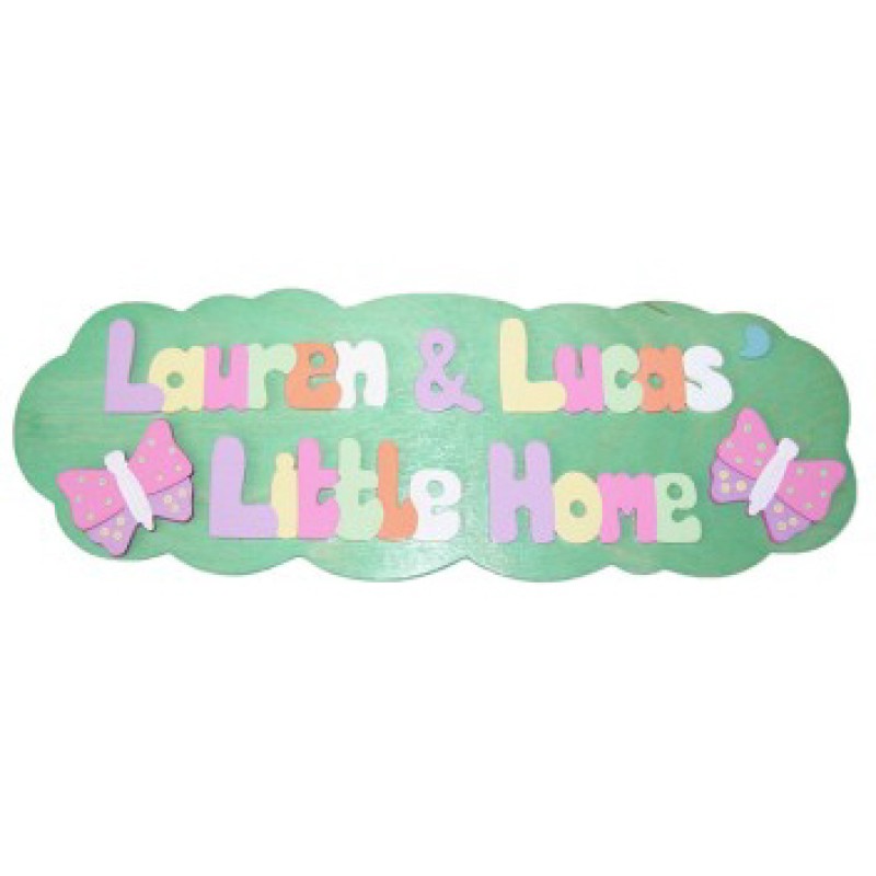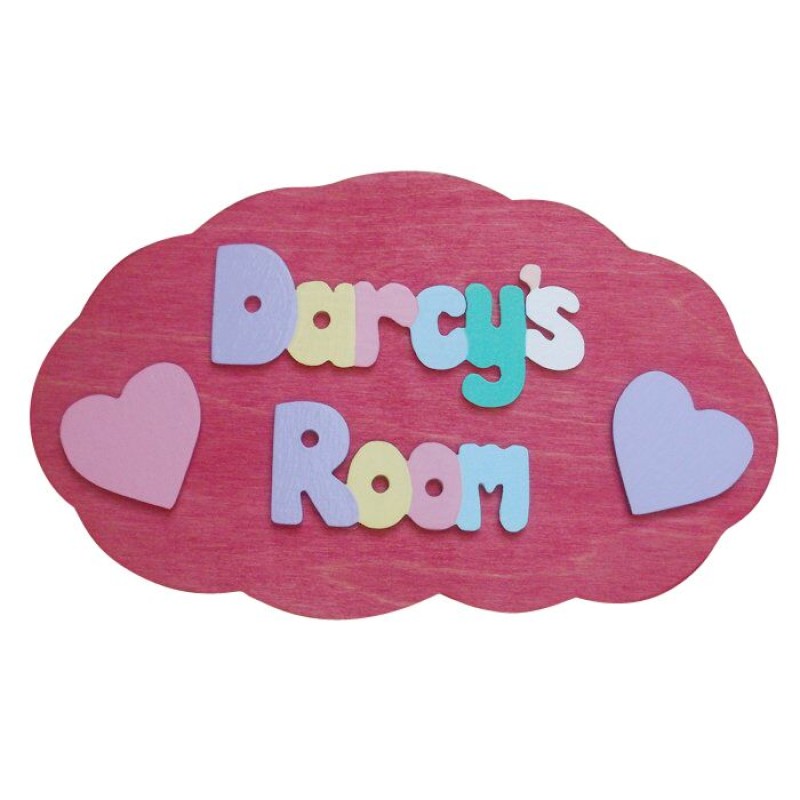 A 3 dimensional plaque which is a variation on our cloud plaques where more than one name can be added on a wider plaque. Each plaque includes two small shapes (one on either side). The cars, trains, tractors and jungle animals are in bright colours and the butterflies, flowers and hearts are in pastel colours.