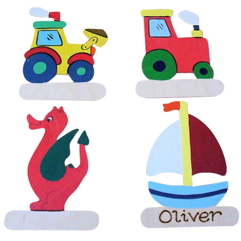 Size of our bright coloured plaques: Yacht 17.5cm high x 12.5cm wide; Tractor 15cm high x 12.5cm wide; Digger 16cm high x 12.5cm wide; Dragon 17cm high x 12.5cm wide
