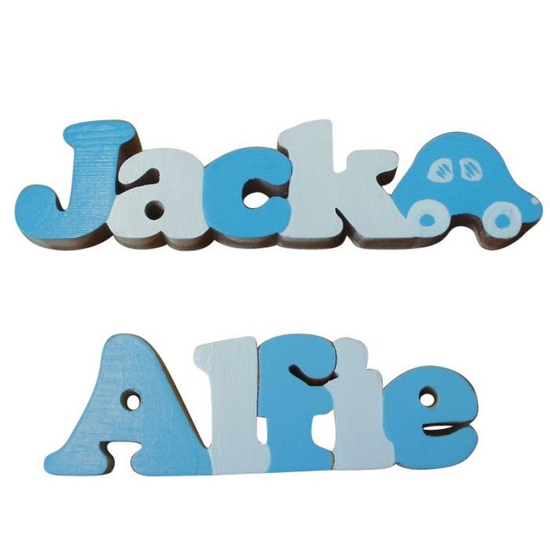 These blue & white coloured names are made from solid pine and are free standing, they can also be used as door plaques (stickers supplied). The front is hand painted with the sides and back left in the natural wood as shown in the images.