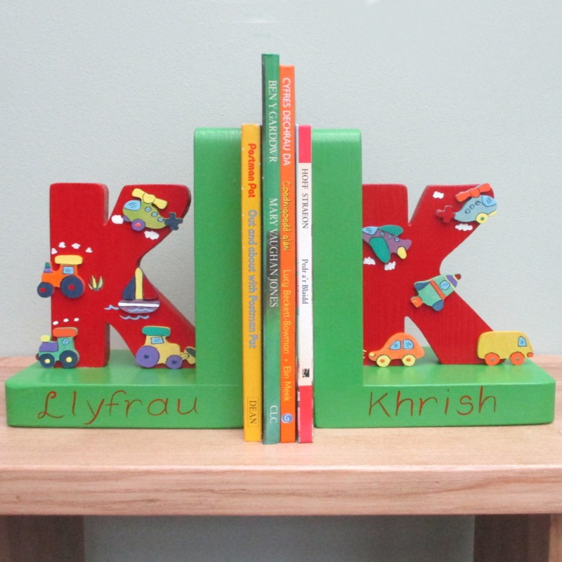 Chunky wooden brightly coloured initial bookends. They are finished in a choice of either jungle, vehicle, dinosaur or space cut outs, there is also a choice of coloured initials and ends. The front of the bookends can also be personalised (if required).